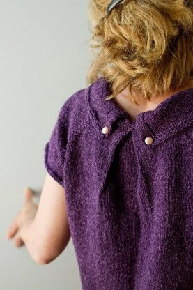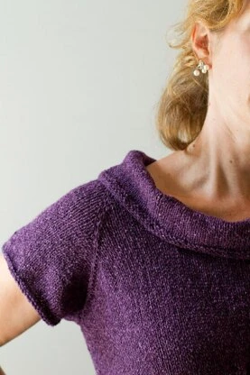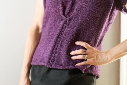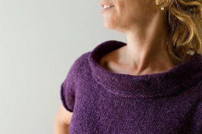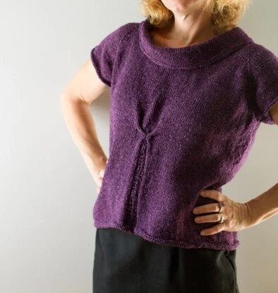 BabyCocktails’ Gibson is a 60’s style sweater with a portrait neckline and other fun details. This unique shell combines that vintage feel with a more casual yarn, Elsebeth Lavold’s Silky Wool, for a top that can be worn in the office or out. This sweater is knit in the round from the top down.