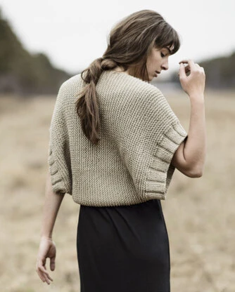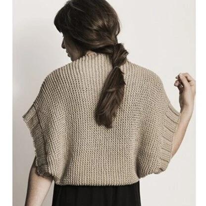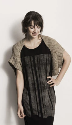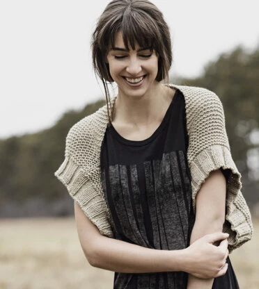 The Afton Shrug from Blue Sky Fibers is a simple rectangle that’s knit in one piece and joined under the arm. This layering piece works well with jeans and dresses and is great for all seasons. It’s knit in Organic Cotton Worsted, a soft yet sturdy two-ply, in garter stitch with a wide rib.