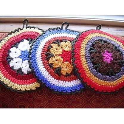 Cute & colorful potholders by ChickenBetty will add a splash of color to your kitchen. This useful and decorative potholder/hotpad is a great way to use up scraps of wool or cotton and add coordinating accessories to your home! These would also make a great housewarming gift. Only use a 100% wool or wool/cotton blend for this project to avoid burning or melting with other fibers.Â