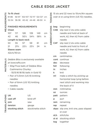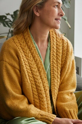 Debbie Bliss Cable Edge Jacket is a lovely women’s sweater you’ll want in your winter wardrobe, and it is perfect for lounging around the house or on your walks through the woods knit in Cashmerino Chunky. This lovely piece showcases the cable patterns up the front and around the neck’s back and down the other front with dropped-shoulder sleeves. The jacket is knit flat in pieces and then seamed together. Cashmerino Chunky by Debbie Bliss is soft and lovely. This yarn has a great loft that will offer a good amount of warmth during the cooler months. Cashmerino Chunky would be a fantastic choice for this jacket! The cable pattern is in written form only.