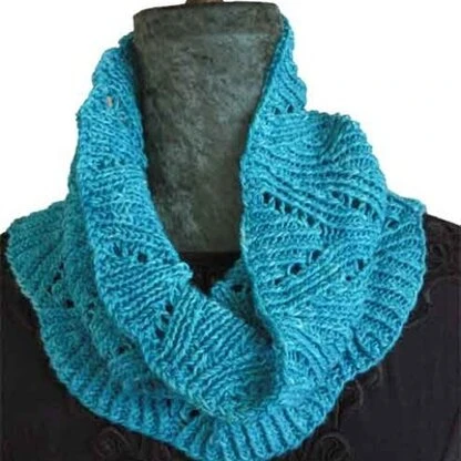 Like the branching of a lazy river, the stitches of the Fiber Dreams Lazy River Cowl split and merge, flowing from one edge to the other. This cowl is fully reversible, though the twisted stitches only show on one side. Because the entire cowl is ribbed, it is so stretchy that it could also be worn as a capelet. The cowl is knit in the round, and large needles and two strands of fingering weight yarn held together make this project a quick knit. This cowl is a beautiful accompaniment to the Stream mitts pattern by Fiber Dreams. Stitch patter is both charted and written out.