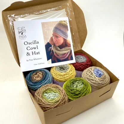 The Freia Minikin Fingering Ombré Palette 6 pack is a set of six 25g minikins of Freia’s popular single-ply cruelty-free US Merino yarn that is hand-dyed in a wide range of vibrant self-striping colorways. With 642 yds included in each pack, the project possibilities are nearly endless! Create fun and colorful hats, cowls, and shawls or use the minikins to add a vivid splash to a larger project like a colorwork yoke sweater. Each Minikin pack also includes instructions for Freia’s Oscilla Hat & Cowl!