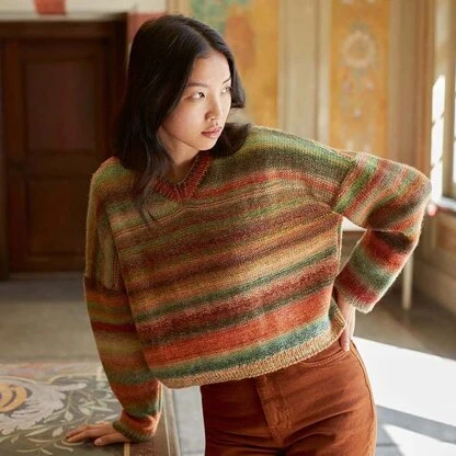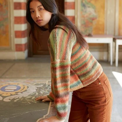 Lang PTO46-01 Sweater is a gorgeous women’s stripey relaxed pullover knit in Frida, a self-striping yarn featuring a v-neckline and dropped shoulders in reverse stockinette. The sweater is knit flat in pieces and then seamed. The neckband stitches are picked up along the neck edge and worked in the round. Frida by Lang Yarns has beautiful colors inspired by the beautiful works of Frida Kahlo. This yarn stripes in color combinations reminiscent of Kahlo’s painting and is sure to delight.