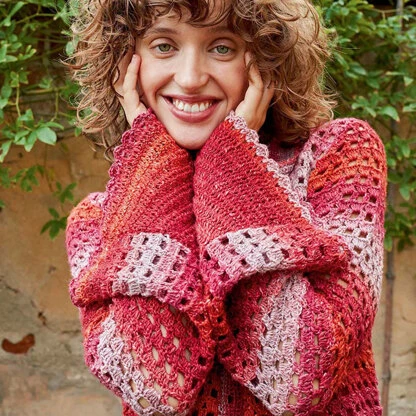 Lang PTO57-04 Crochet Jacket is a beautiful lace cardigan with a crew neckline, A-line silhouette, and belled sleeves. Lang Linello is a blend of linen, cotton, and viscose that has great drape and texture with gorgeous self-striping colorways. This jacket is crocheted flat in pieces and seamed together with the collar and buttonband completed after seaming. Inserts add flare to the sleeves and give them their belled shape for a bit of drama. For a go-to layer that will transition through the seasons with you, this jacket from Lang is a great choice! Crochet stitch pattern is charted only.