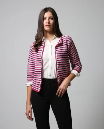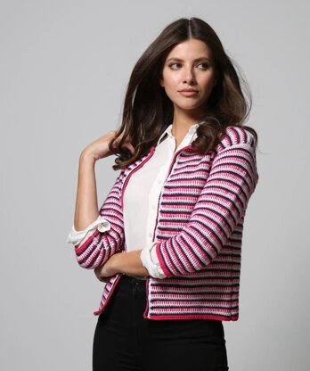 The Amalia Jacket from MillaMia is the perfect jacket to transform an outfit into something more elegant. With shaping similar to the classic style that Coco Chanel originally made famous, this is sure to become a wardrobe staple. MillaMia Naturally Soft Merino is a smooth and machine-washable yarn that’s lovely to work with and to wear. Jacket is crocheted flat in pieces from the bottom up and seamed with stripes of three colors alternating throughout. Choose sharp contrast or smooth tonal colors for dramatically different looks! Pattern uses UK crochet terminology with a key included with corresponding US terms.