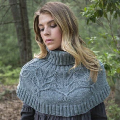 Norah Gaughan Baroque is part of a series of pieces with interchangeable charts. The charts from Swirl, Rope & Braid, and Ladybug can also be used to make a capelet following the Baroque instructions. This lovely capelet is knit from the top down in the round, and the neck trim is added later. The elegant cabling makes this accessory very special, and you’ll want more than one in your wardrobe. The cable pattern is in chart form only.