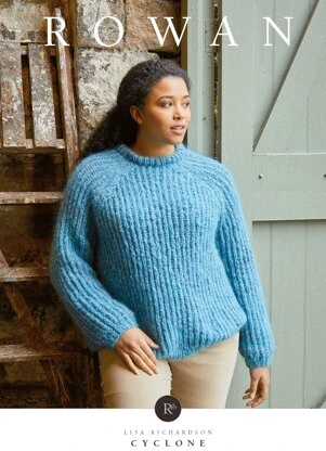 Rowan Cyclone from Tweed Haze is a fabulous and cozy raglan women’s pullover using a slip stitch rib throughout. The sweater has a traditional crew neck, long sleeves, and a bit longer length hem for a good fit. Cyclone is knit flat in pieces from the bottom up and then seamed. Rowan Tweed Haze is perfect for a lightweight jumper or cozy scarf. This yarn just might become your go-to fun yarn!