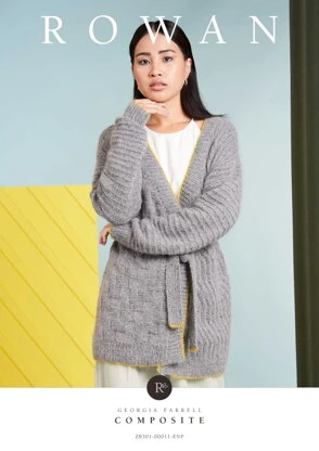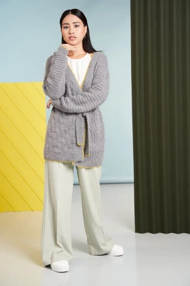 Rowan Composite from Abstract is a lovely women’s classic wrap cardigan full of texture with a delicate color tipping on the cuffs, hem, and belt knit in Felted Tweed and Kidsilk Haze held together throughout. This fun sweater has a block pattern on the right front and a traveling cable pattern on the left. The dropped shoulder sleeves feature horizontal purl bump stripes. Rowan Felted Tweed is a luxurious blend available in a delightful array of heathered shades. The cable patterns are in chart form only.