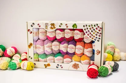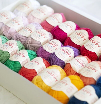 Open a box full of happiness with the Sirdar Happy Cotton Assortment Pack! This box of 50 pint-sized mini skeins has a spectacular color range from subtle neutrals to cheery brights and everything in between. Use this smooth, machine-washable cotton yarn to create DK weight projects like amigurumi and baby items—anything small that just seems better bursting with color! Each mini-skein is 20 grams and approximately 47 yards, giving you a whopping 2,350 yards of vibrant color to use as your palette in your next project!Â