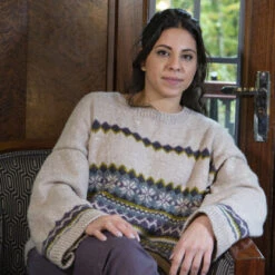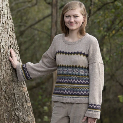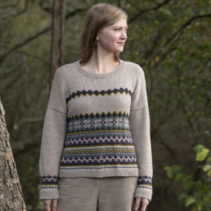 The Fibre Co. Star Anise from the Almanac Series is a gorgeous women’s Fair Isle sweater knit in Acadia. This lovely sweater features a boxy relaxed fit, dropped shoulders with a high or crew neckline options. Star Anaise is knit in pieces from the bottom up and then seamed. Fibre Company Acadia is a stunning blend of Merino, baby alpaca, and silk. It has a slight tweedy appearance because the silk takes the dye slightly differently. The Fair Isle patterns are in chart form only.