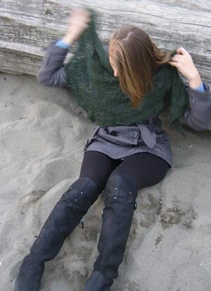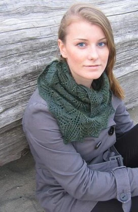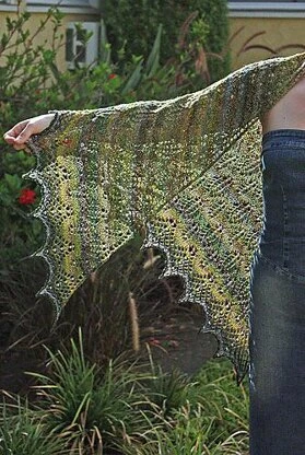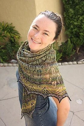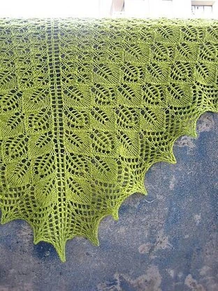 Graceful leafy lace radiates outward, forming a generous scarf-sized shawl. Beads can be incorporated in to the Photosynthesis Shawl to highlight the structure of the lace if desired — but the shawl is equally lovely as a simple lace piece. The pattern includes both charts and written instructions. This triangular shawl is knit in one piece from the center back point down to the edging.
