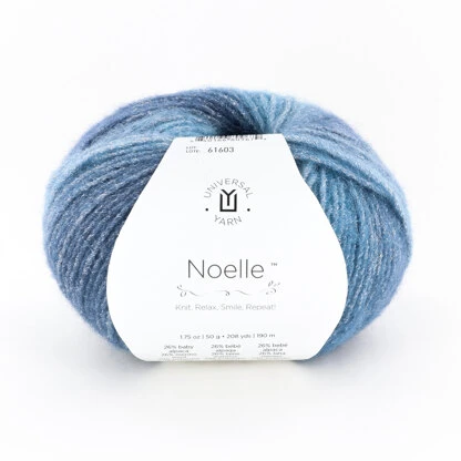 Noelle from Universal Yarn blends luxurious baby alpaca and Merino wool with polyester and nylon to create a lightweight and lofty yarn with a hollow core. The yarn has a soft haze, yet retains its stitch definition, making it perfect for cool weather projects. The subtle color shifts add depth and interest to knit and crochet fabric.