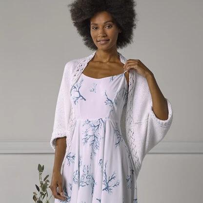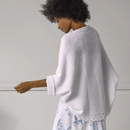 shrug is knit in Montague with fine details such as eyelet lace sleeve and