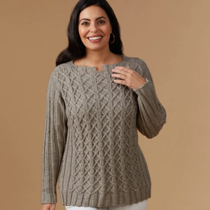 versatile DK weight. The sweater features a split crew neckline, long set-in