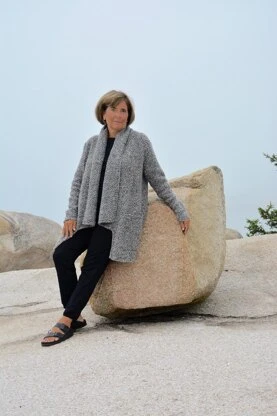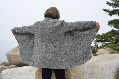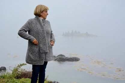 Granite Island from VERSACIKNITS is a contemporary take on the typical sweater coat. This womenās sweater, replete with big pockets and an oversized shawl collar, is the type of garment you will want to wear all winter long ā inside and out! Granite Islandās A-line shaping makes it flattering for just about everyone; the moss stitch pattern enhances the beautiful Donegal tweed coloring.Ā
